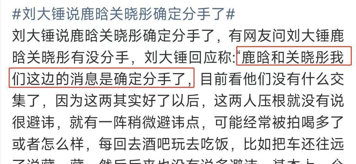 没想到12月20号,鹿晗和关晓彤又因为感情事儿冲上热搜,这回是名声在外的狗仔刘大锤又出马了,拍着胸脯说,他们俩真的分开了。后来还特地跟那些一直关心他们的粉丝们透露了一下,之前碰到他们时的情景,
